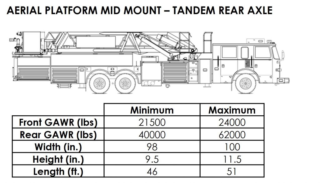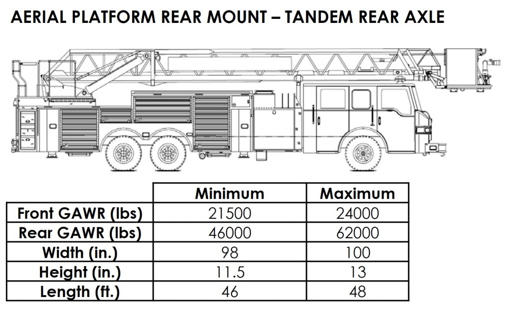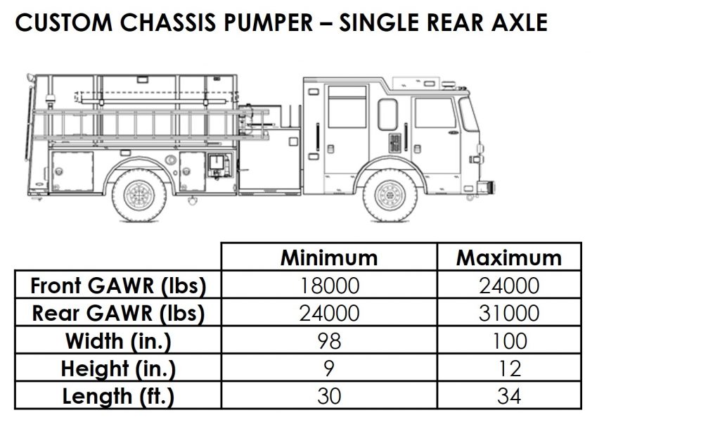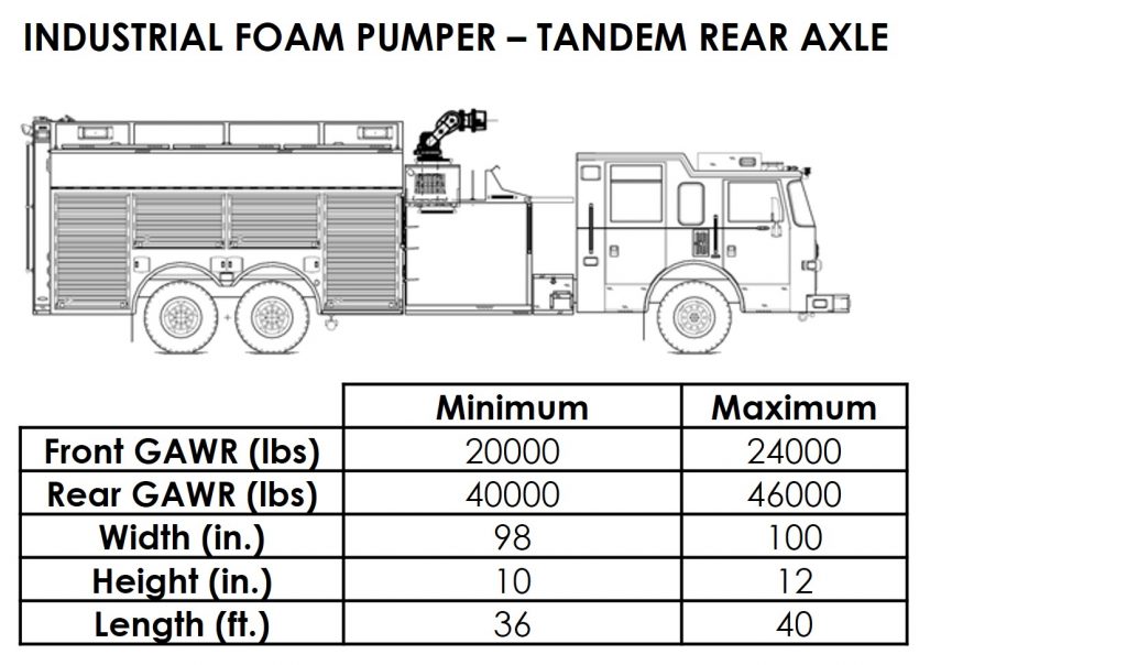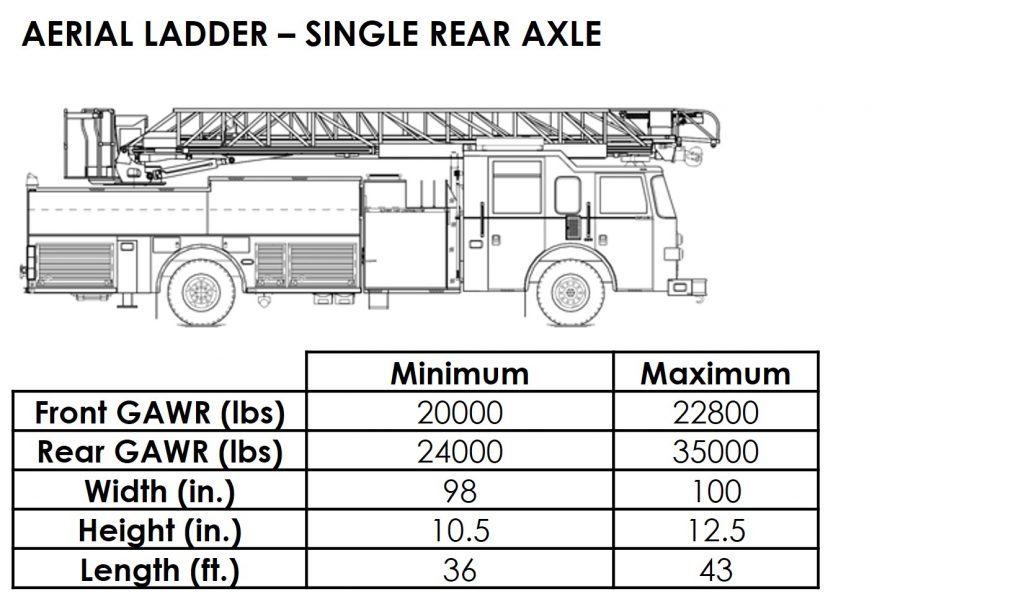 The National Fire Protection Association maintains performance standards that apply to fire apparatus. NFPA 1901 Standard for Automotive Fire Apparatus[1] is adhered to by nearly every fire apparatus purchasing authority in the U.S. This NFPA standard establishes operational and safety criteria for all aspects of fire apparatus including the minimum water, equipment and hose capacity for each type of apparatus. These criteria necessitate the use of high capacity axles. The standard intentionally excludes any reference to vehicle size or weight limitations. Various emergency vehicle configurations and their range of typical sizes and weights are presented in Appendix A.