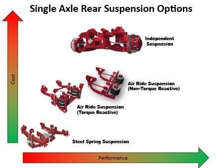 There are 4 basic rear suspension types: multi-leaf spring, rubber, air ride, and independent. This guide will provide a description, pros and cons, operating environment considerations, and capacity ranges for each suspension type.
